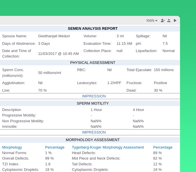 View structured and standardized semen analysis reports – designed in consultation with embryologists to ensure accuracy and clarity.
